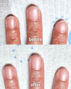 甘皮や爪まわりの角質を丁寧に除去し、保湿成分をしっかり奥まで浸透させていきます。