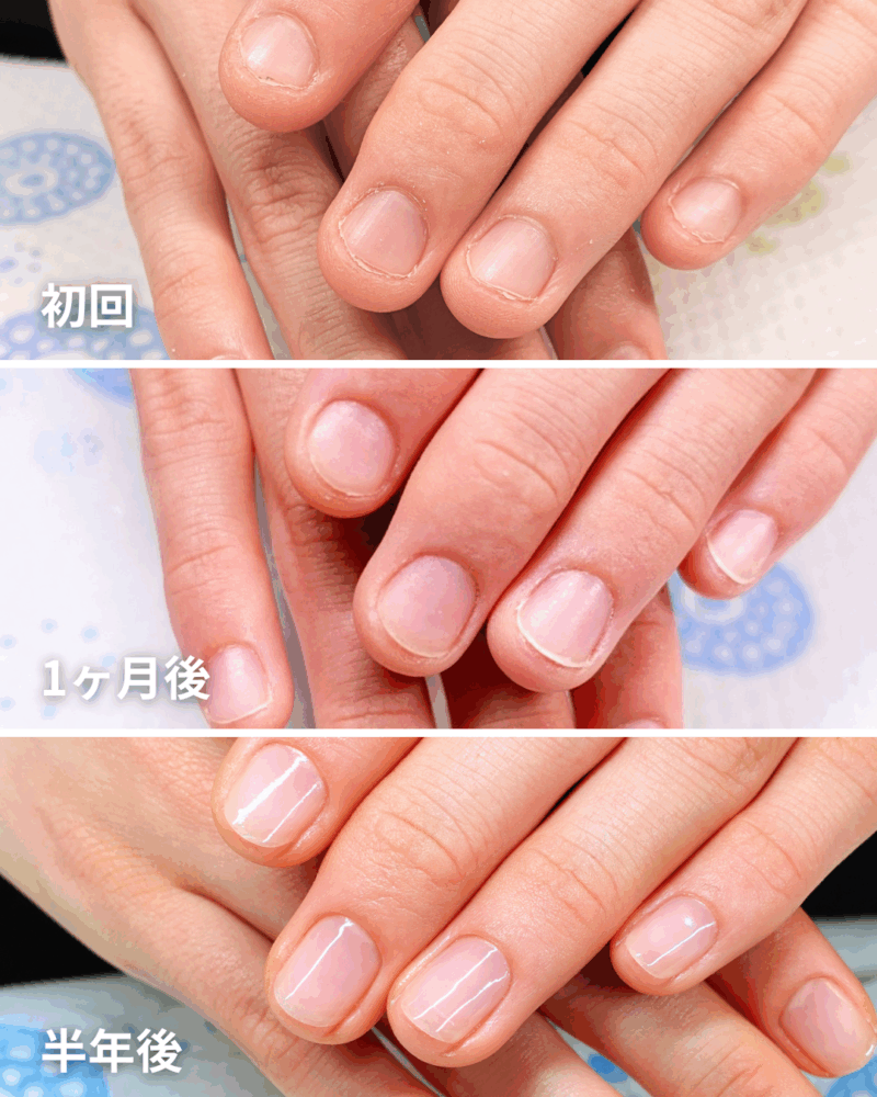 こちらのお客様は順調に伸びていますが、皮膚や爪はとても繊細なため、負荷をかけず、ややゆっくりめのペースでケアを進めてきました。